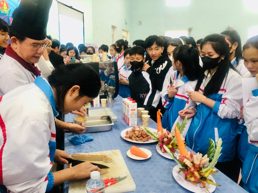 Tại buổi truyền thông, trung tâm Reach chuẩn bị dụng cụ, nguyên vật liệu mời học sinh trải nghiệm tự pha chế đồ uống, chế biến và trang trí món ăn.
