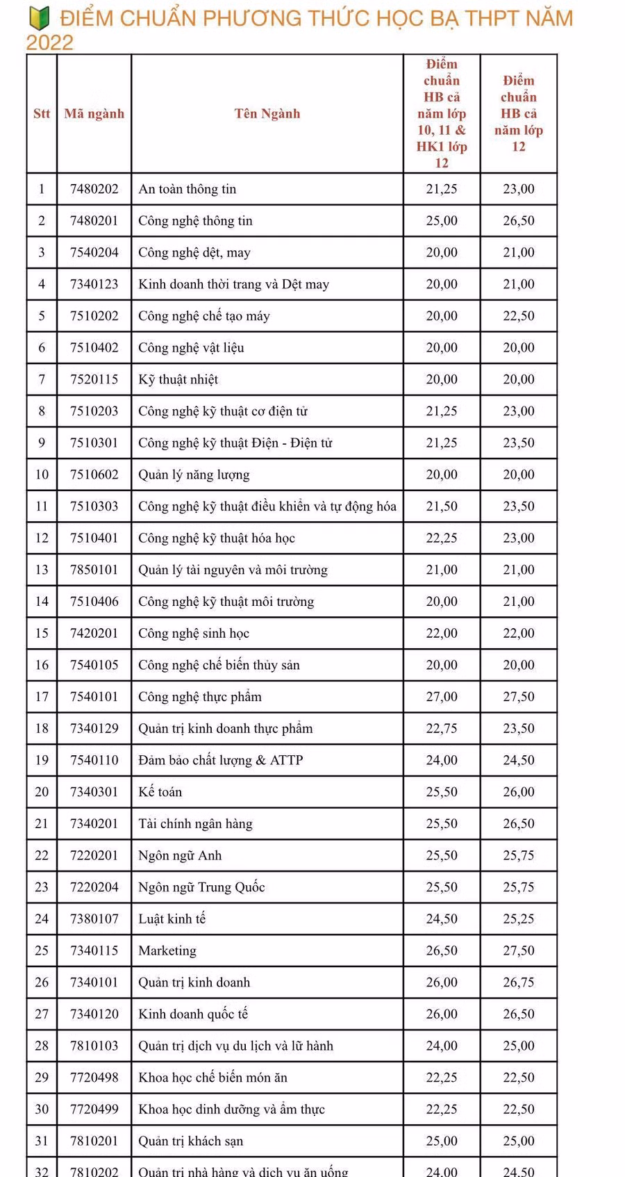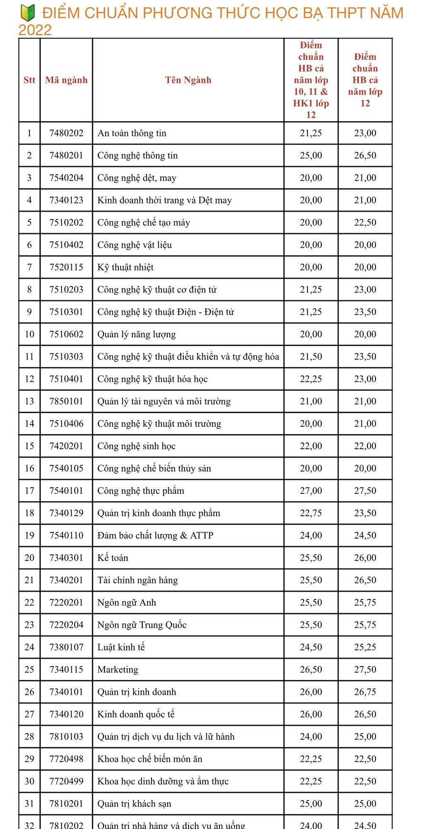 Ở phương thức xét tuyển học bạ THPT, điểm chuẩn xét cả năm lớp 10, 11 và HKI lớp 12 là từ 20- 27 điểm. Ngành Công nghệ thực phẩm là ngành có điểm chuẩn cao nhất, kế đến là các ngành Quản trị kinh doanh, Kinh doanh quốc tế 26 điểm và Marketing, 26,5 điểm.