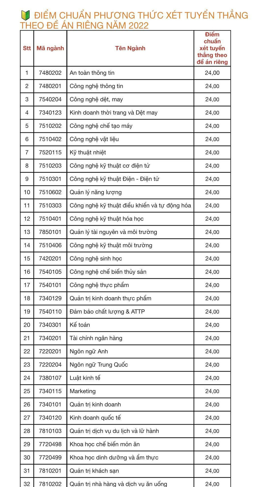Ở phương thức xét tuyển thẳng theo đề án tuyển sinh riêng 2022 của HUFI, điểm chuẩn tất cả các ngành đều 24 điểm.