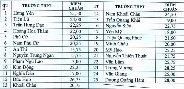 Điểm trúng tuyển vào các trường THPT công lập trên địa bàn Hưng Yên như sau: