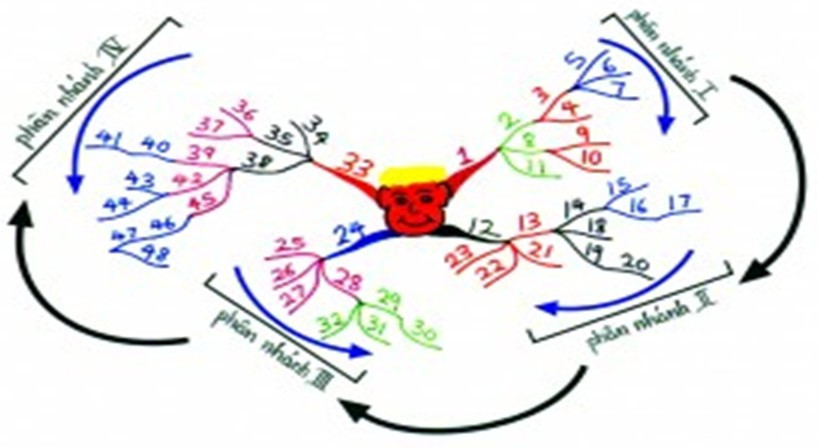 Tuy nhiên, các từ khóa được viết và đọc theo hướng từ trên xuống dưới trong cùng một nhánh chính (các mũi tên màu xanh trong hình vẽ).