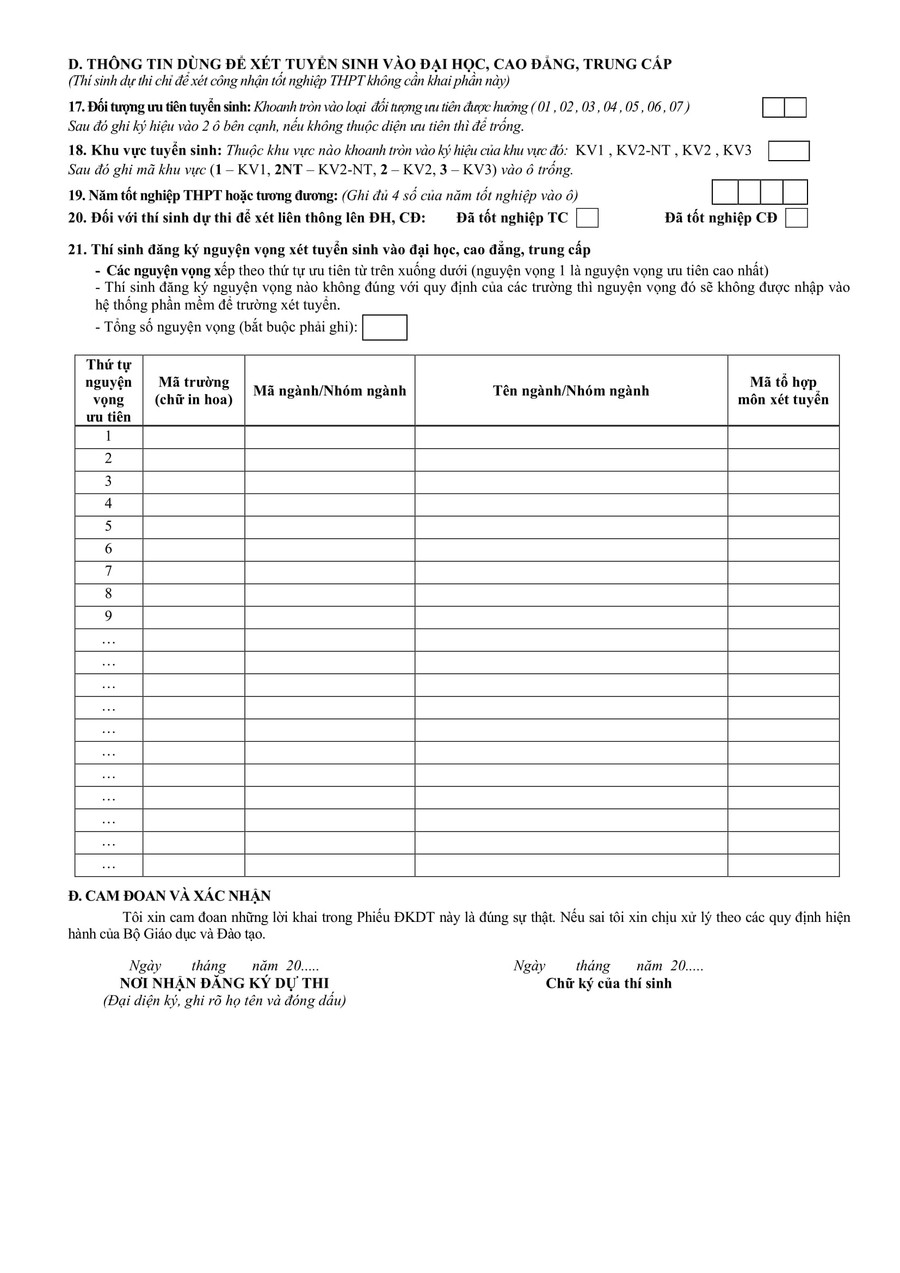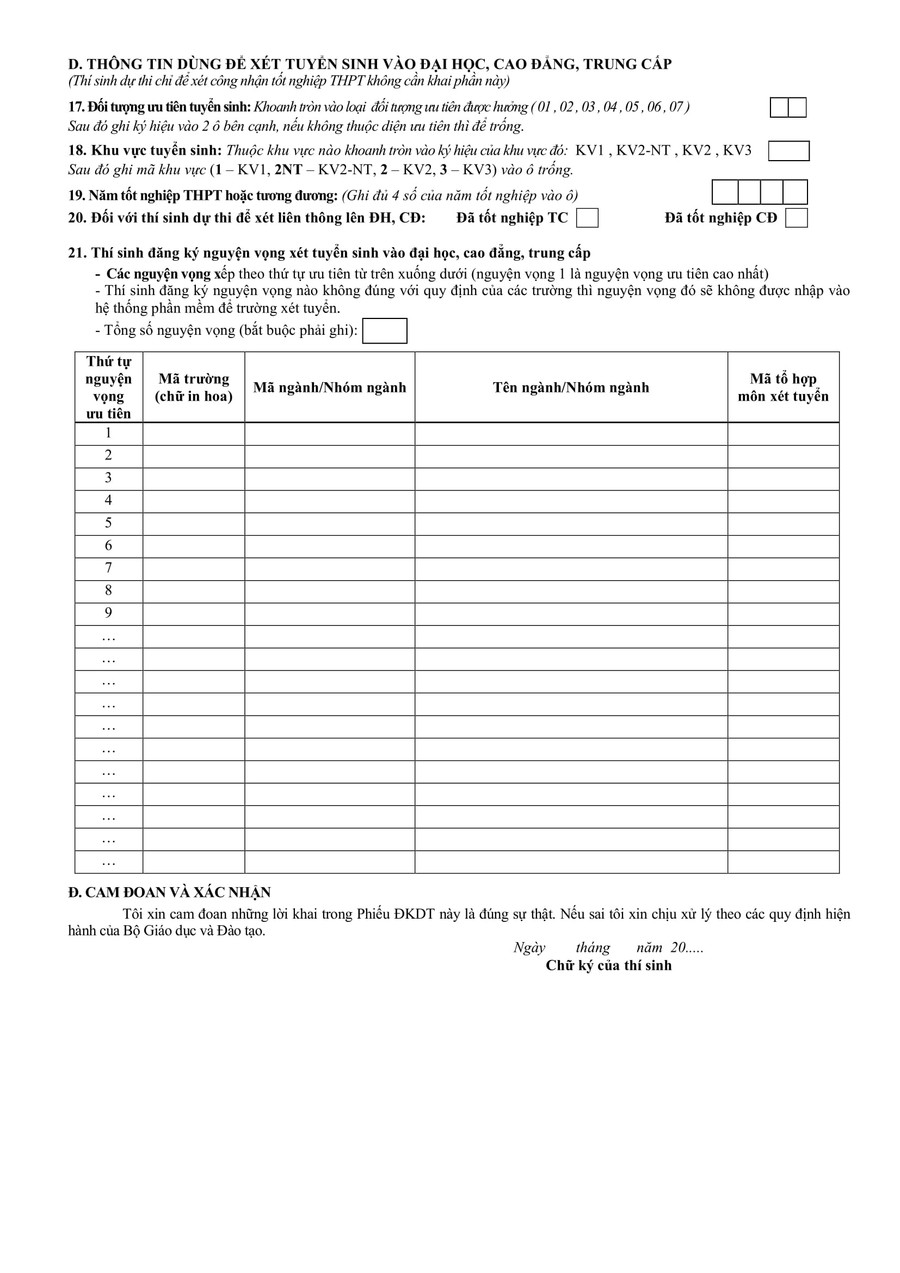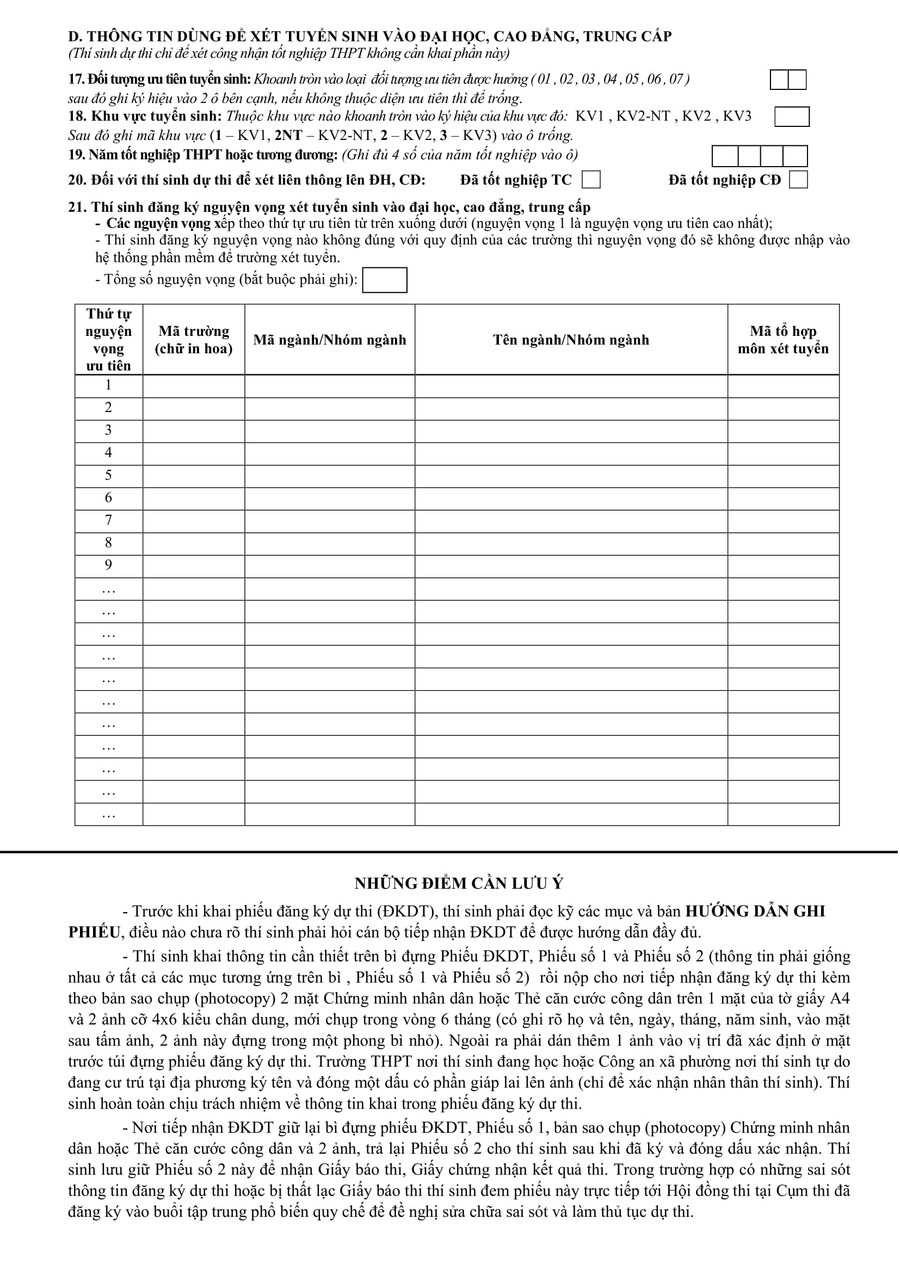 Mục 1, 2: Ghi theo hướng dẫn trên Phiếu đăng ký dự thi THPT quốc gia và xét tuyển sinh vào đại học, cao đẳng, trung cấp (sau đây gọi tắt là Phiếu ĐKDT).