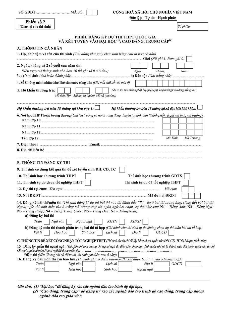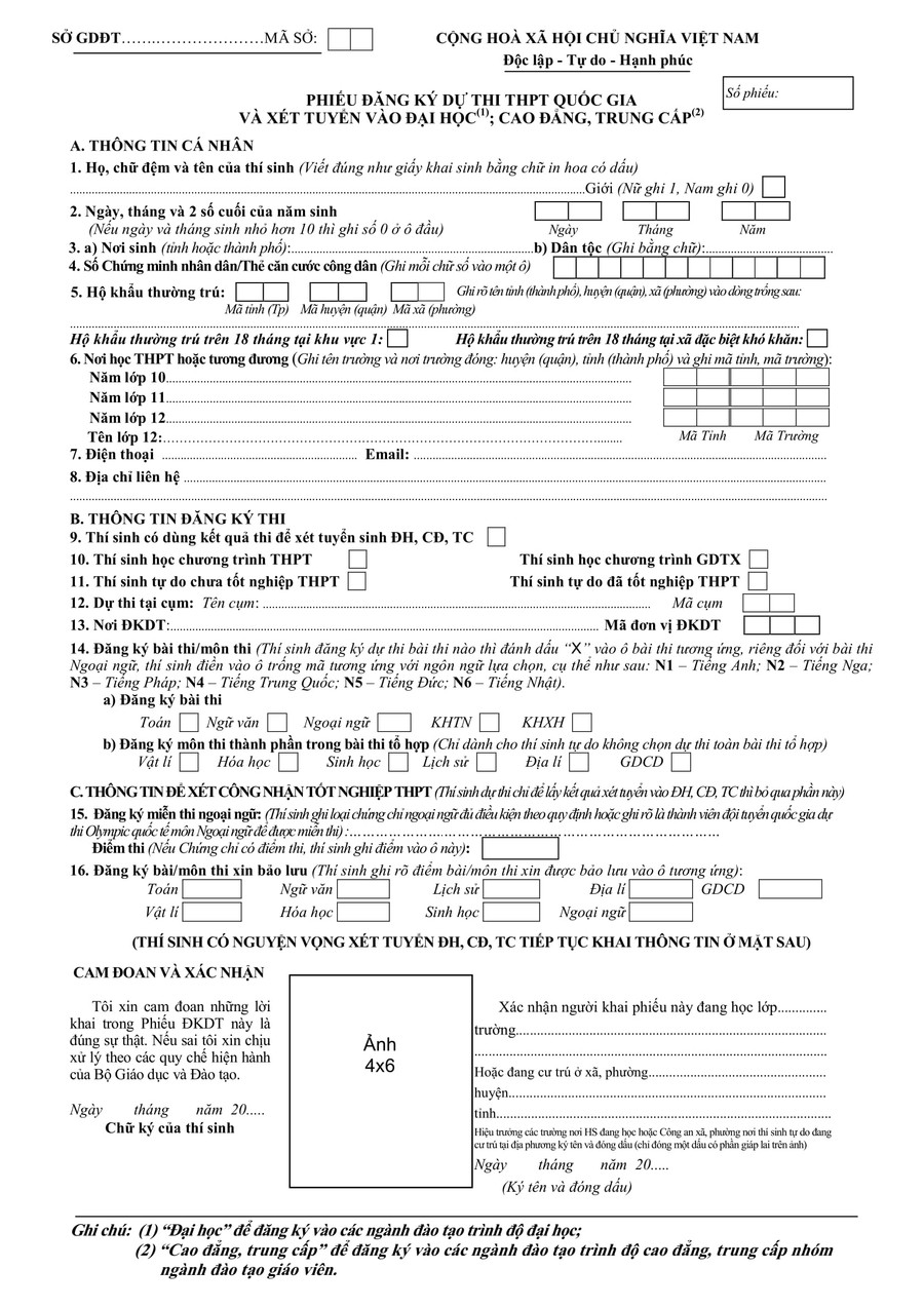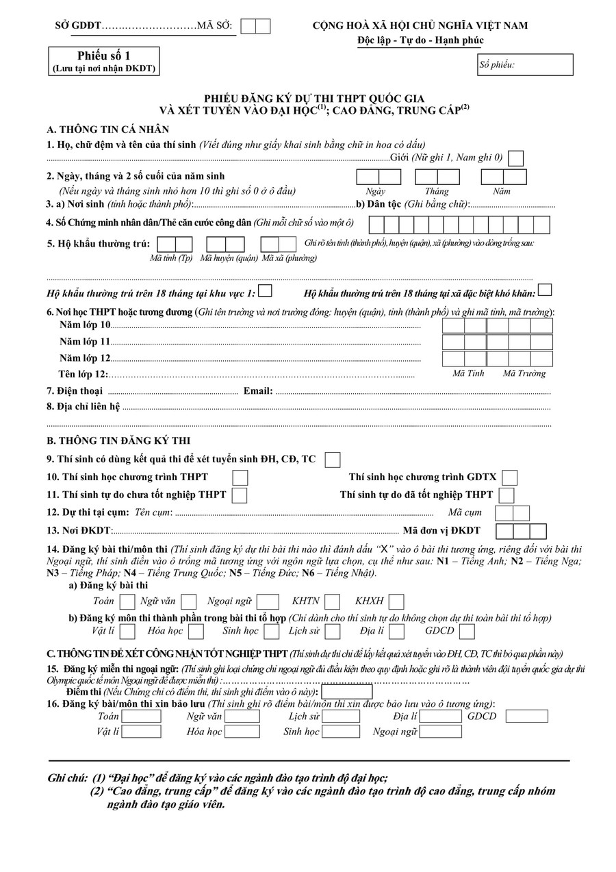 Mục 1, 2: Ghi theo hướng dẫn trên Phiếu đăng ký dự thi THPT quốc gia và xét tuyển sinh vào đại học, cao đẳng, trung cấp (sau đây gọi tắt là Phiếu ĐKDT).