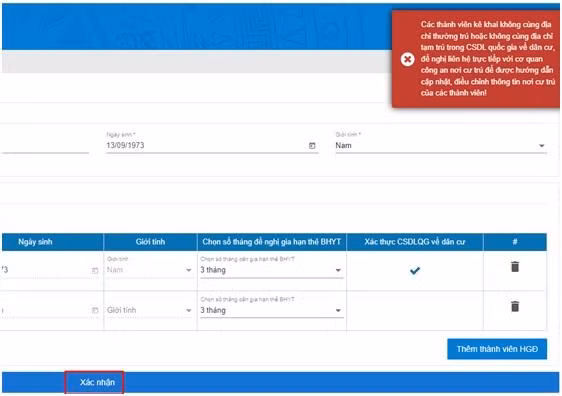 + Nếu các thành viên không cùng địa chỉ thường trú hoặc không cùng địa chỉ tạm trú trong CSDL quốc gia về dân cư, khi xác thực hệ thống sẽ thông báo: