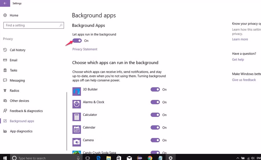 Bước 2: Trong mục Privacy => Background apps, chúng ta có thể chọn tắt ứng dụng nào không cần chạy ngầm nữa. Ở bản Windows 10 Creators Update, chúng ta còn có thể tắt tất cả ở tùy chọn Let apps run in the background bằng cách click để chuyển sang chế độ Off.
