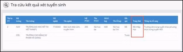Trạng thái thông tin của thí sinh “Đã nhập học” nghĩa là thí sinh đã xác nhận nhập học thành công và trường Đại học đã nhận được thông tin xác nhận nhập học của thí sinh.