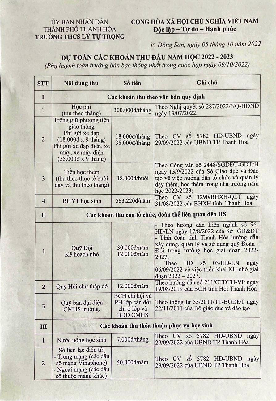 | Bảng dự toán kế hoạch các khoản thu đầu năm học 2022 - 2023 của Trường THCS Lý Tự Trọng. |
