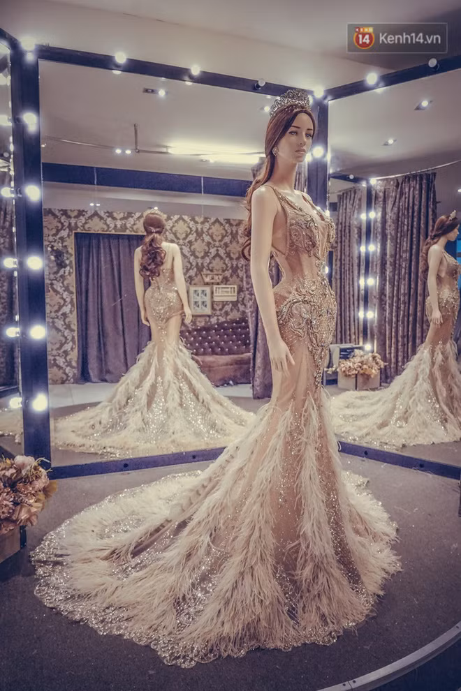 Màu vàng ánh kim được chọn làm tông màu chủ đạo giúp bộ cánh mà Huyền My sẽ diện thêm phần quyền lực. Đuôi cá gắn lông vũ giúp cân bằng tăng thêm nét mềm mại tăng, duyên dáng của người mặc.