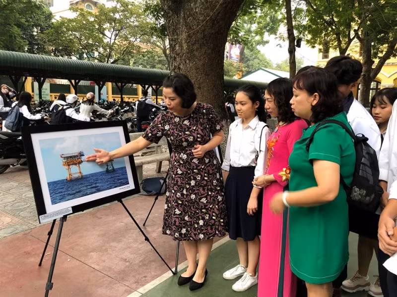 | Các bức ảnh về biển đảo được trưng bày trang trọng tại sân trường. |