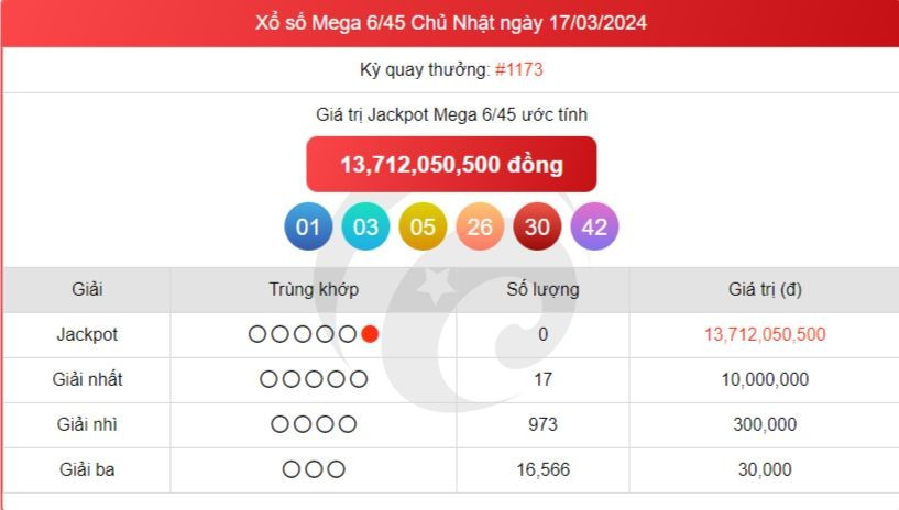 - Giải JACKPOT 1: trùng khớp 6 số, giá trị giải tối thiểu là 30 tỷ đồng và được cộng dồn tích lũy cho tới khi có người đoán trúng.