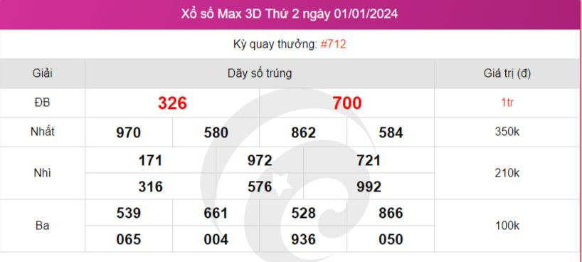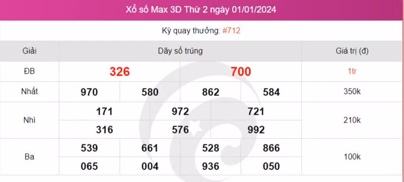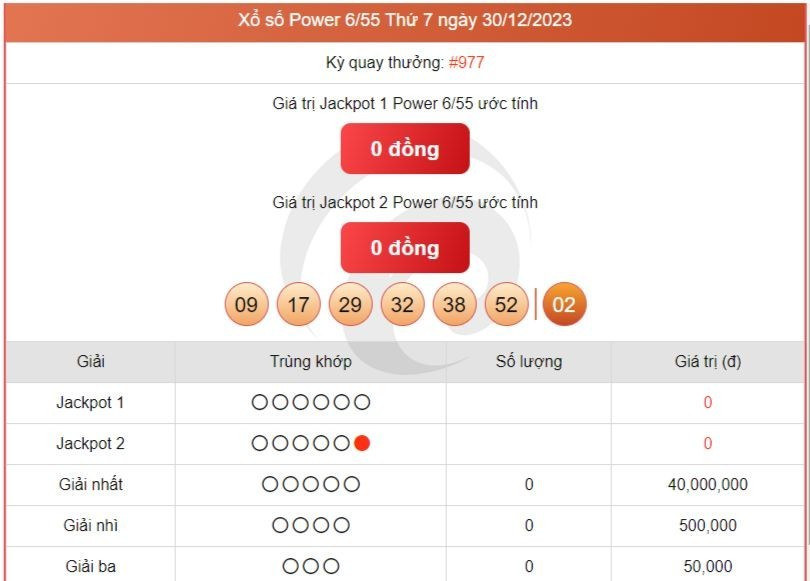 - Giải nhất: Trùng khớp 5 trong 6 số đầu tiên, trị giá 40 triệu đồng cho các vé