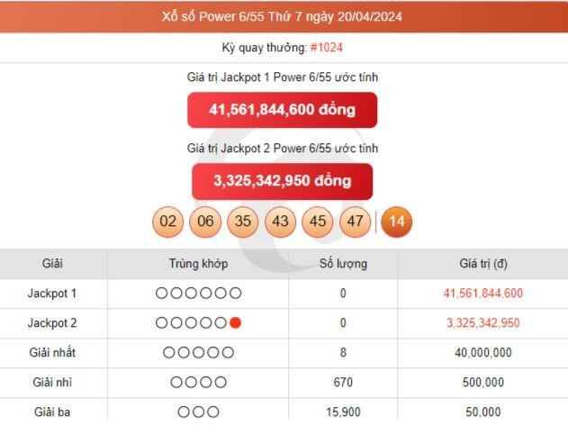 Vietlott 23/4 - Xổ số Power 6/55 23/4 - Vietlott Power 23/4 - Kết quả xổ số Vietlott thứ Ba ngày 23/4/2024