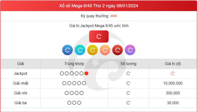 - Giải JACKPOT 1: trùng khớp 6 số, giá trị giải tối thiểu là 30 tỷ đồng và được cộng dồn tích lũy cho tới khi có người đoán trúng.