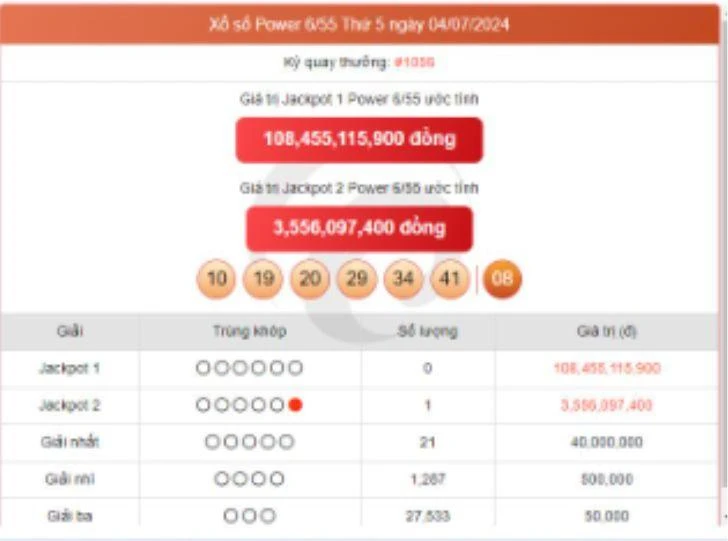- Giải JACKPOT 2: Trùng khớp 5 trong 6 số đầu tiên và số đặc biệt cuối cùng., giá trị tối thiểu là 3 tỷ đồng và được cộng dồn tích lũy cho tới khi có người đoán trúng.