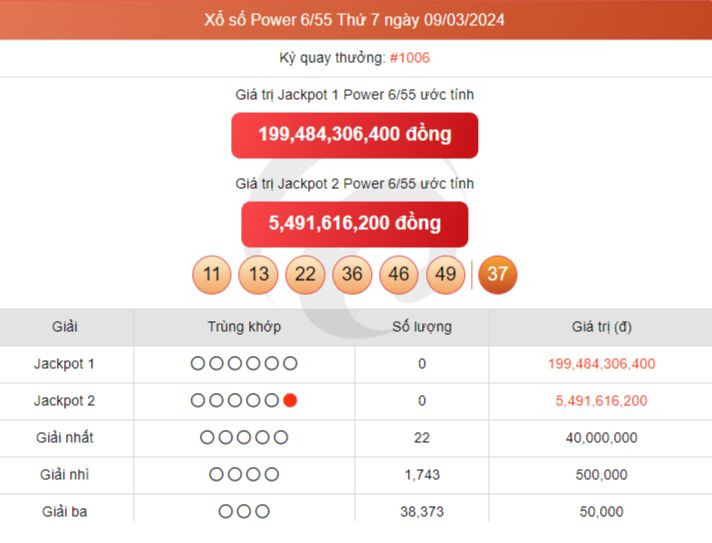 Giải Jackpot: trùng khớp 6 số, giải thưởng trị giá tối thiểu 12 tỷ đồng và tích lũy.