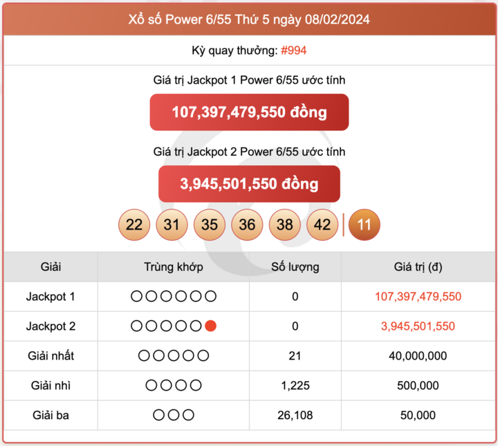 Cập nhật kết quả xổ số Vietlott Power 6/55 8/2 - Vietlott thứ 5 ngày 8/2/2024