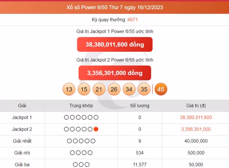 Giải Jackpot: trùng khớp 6 số, giải thưởng trị giá tối thiểu 12 tỷ đồng và tích lũy.