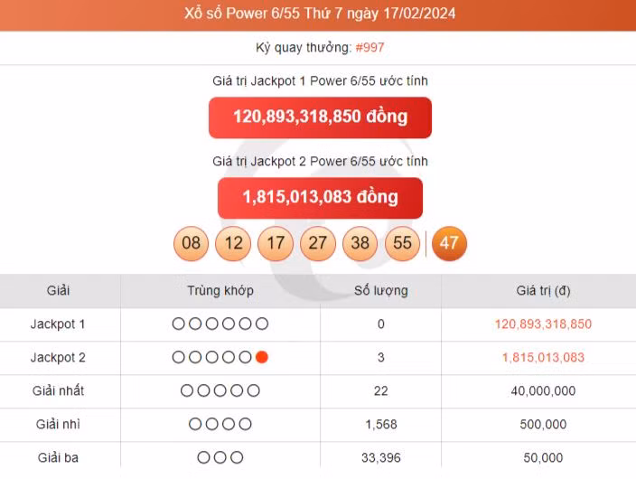 - Giải JACKPOT 2: Trùng khớp 5 trong 6 số đầu tiên và số đặc biệt cuối cùng., giá trị tối thiểu là 3 tỷ đồng và được cộng dồn tích lũy cho tới khi có người đoán trúng.