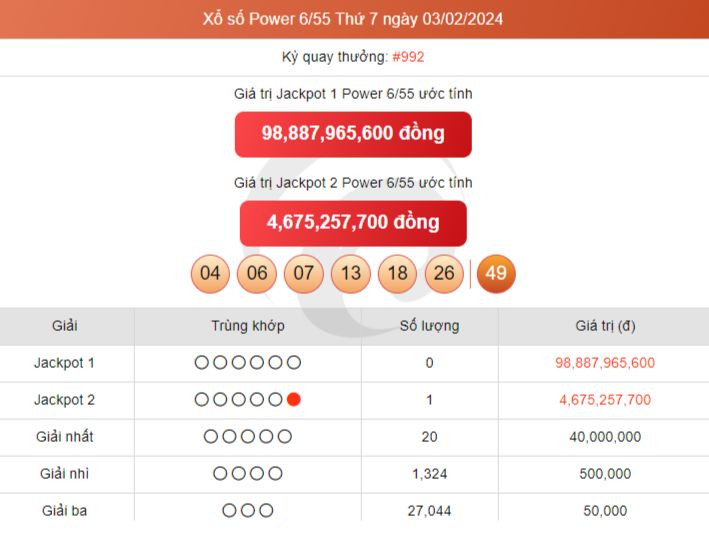 Giải Jackpot: trùng khớp 6 số, giải thưởng trị giá tối thiểu 12 tỷ đồng và tích lũy.