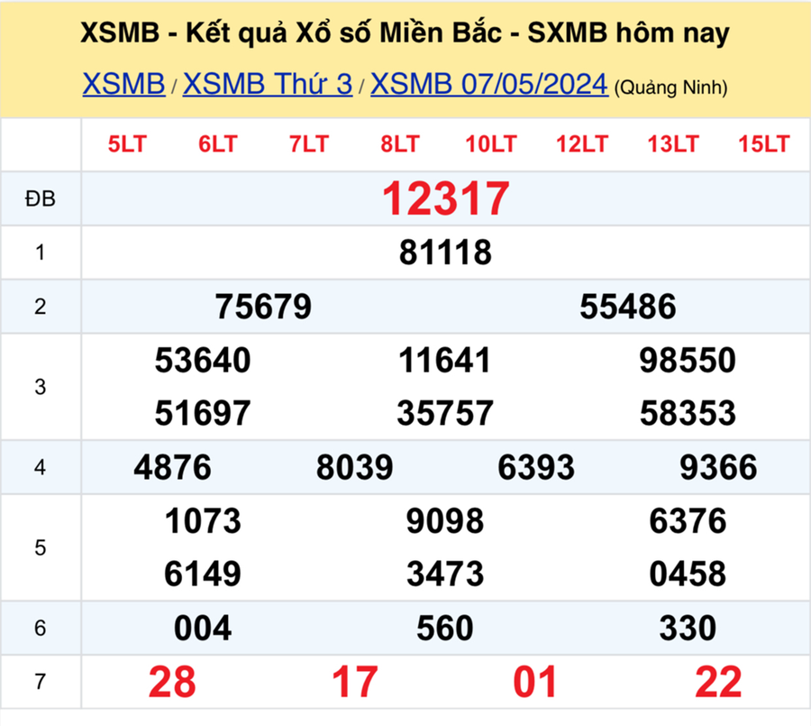 Kết quả xổ số miền Bắc ngày 7/5. KQXSMB 7/5/2024. XSMB 7/5.