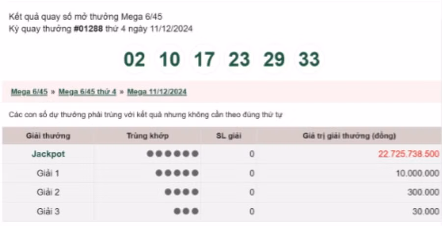 - Giải JACKPOT 1: Trùng khớp 6 số, giá trị giải tối thiểu là 30 tỷ đồng và được cộng dồn tích lũy cho tới khi có người đoán trúng.