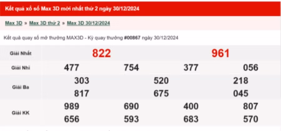 - Giải nhất: Trùng khớp 5 trong 6 số đầu tiên, trị giá 40 triệu đồng cho các vé.