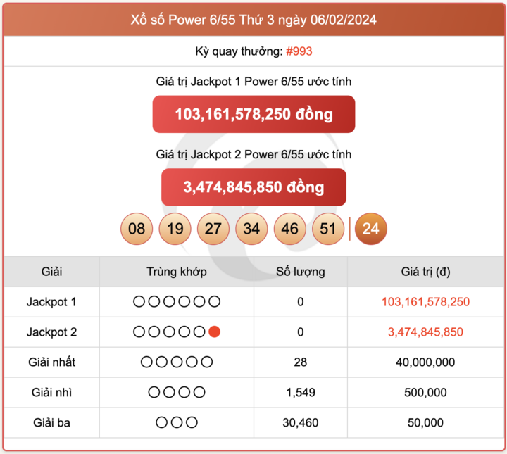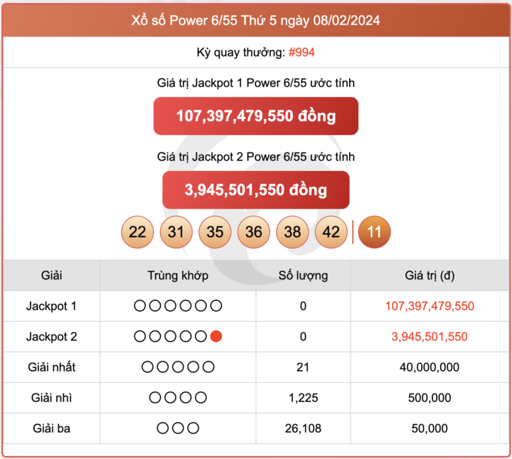 - Giải nhất: Trùng khớp 5 trong 6 số đầu tiên, trị giá 40 triệu đồng cho các vé