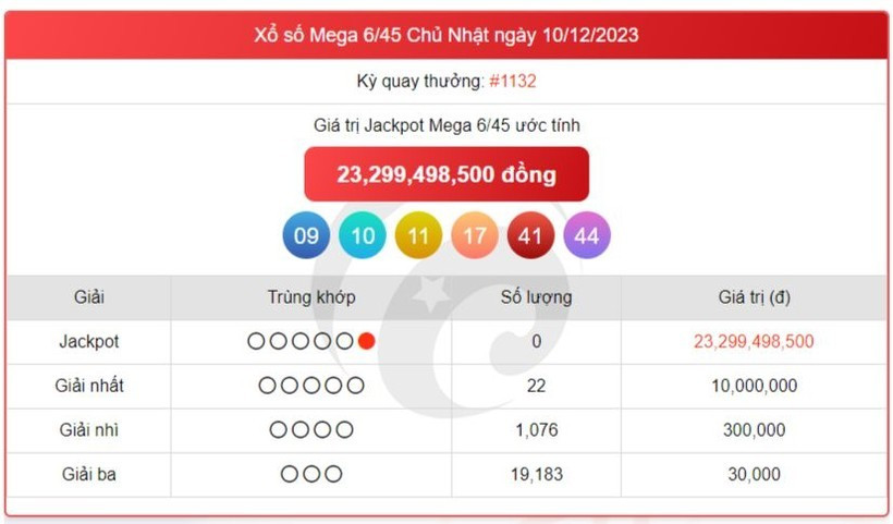 Vietlott Mega 6/45 ngày 13/12. Kết quả xổ số Vietlott Mega 6/45 hàng tuần được cập nhật trên Báo Giáo dục và Thời đại.