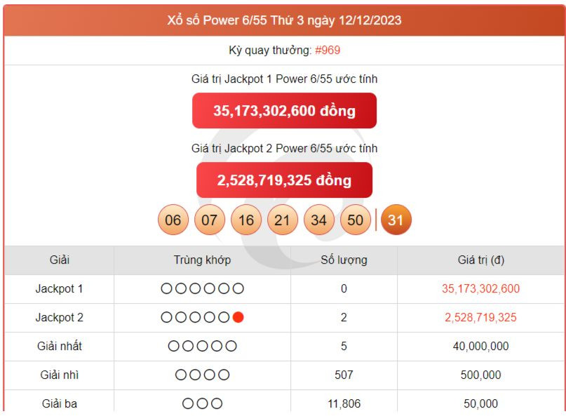 Giải Jackpot: trùng khớp 6 số, giải thưởng trị giá tối thiểu 12 tỷ đồng và tích lũy.