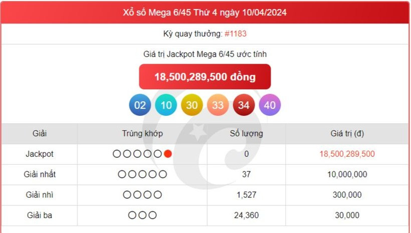- Giải nhất: Trùng khớp 5 trong 6 số đầu tiên, trị giá 40 triệu đồng cho các vé