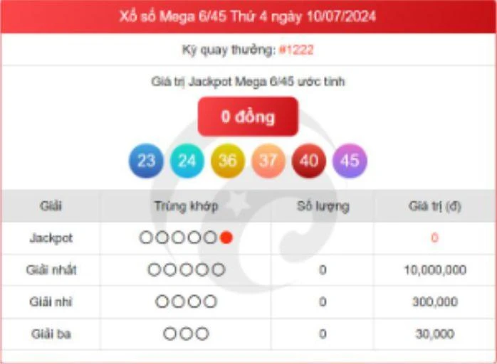 - Giải nhất: Trùng khớp 5 trong 6 số đầu tiên, trị giá 40 triệu đồng cho các vé đoán trúng.