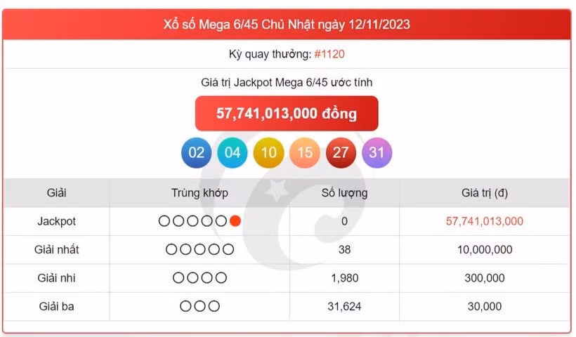 Kết quả xổ số Vietlott Mega 6/45 Chủ Nhật ngày 12/11/2023