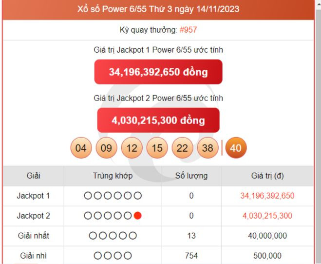 Kết quả xổ số Vietlott Power thứ Ba ngày 14/11/2023