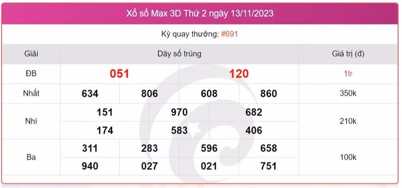 Kết quả xổ số Vietlott max 3D 13/11/2023 - Vietlott thứ Hai 13/11