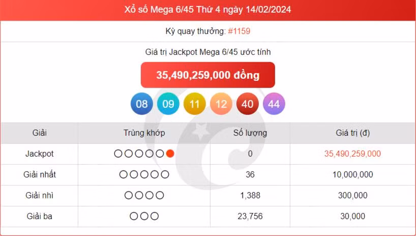 Kết quả xổ số Vietlott ngày 14/2/2024