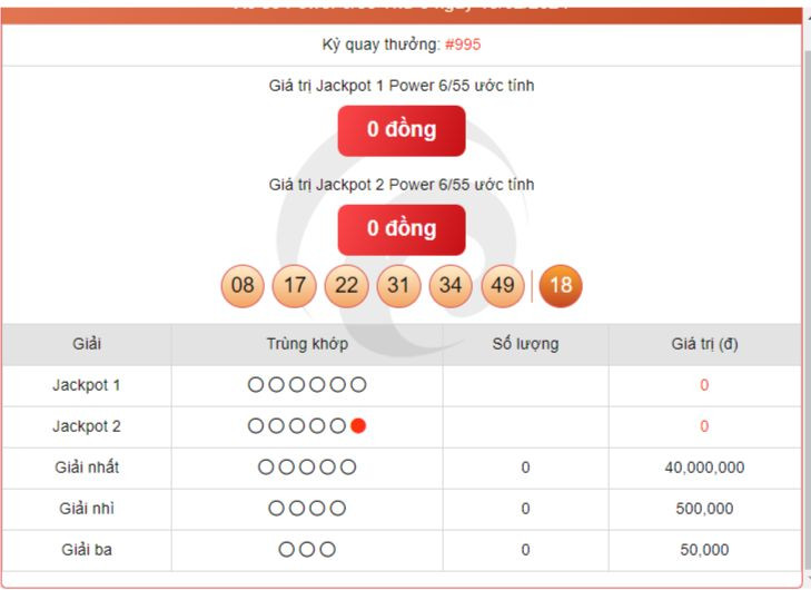 - Giải nhất: Trùng khớp 5 trong 6 số đầu tiên, trị giá 40 triệu đồng cho các vé