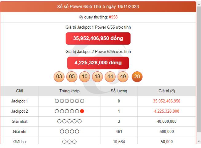 Kết quả xổ số Vietlott thứ Năm ngày 16/11/2023