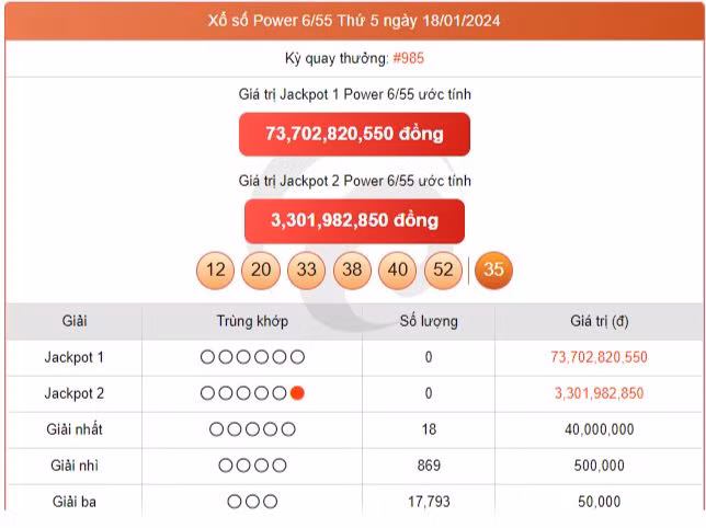 Giải Jackpot: trùng khớp 6 số, giải thưởng trị giá tối thiểu 12 tỷ đồng và tích lũy.