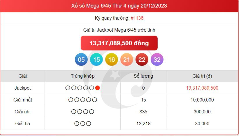 Chi tiết cơ cấu giải thưởng Mega 6/45
