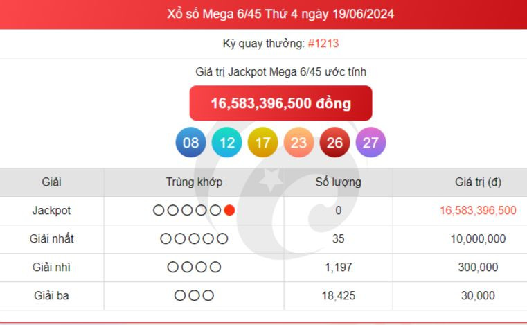 Vietlott 21/6 - Xổ số Mega 6/45 21/6 - Vietlott Mega 21/6 - Kết quả xổ số Vietlott thứ Sáu ngày 21/6/2024