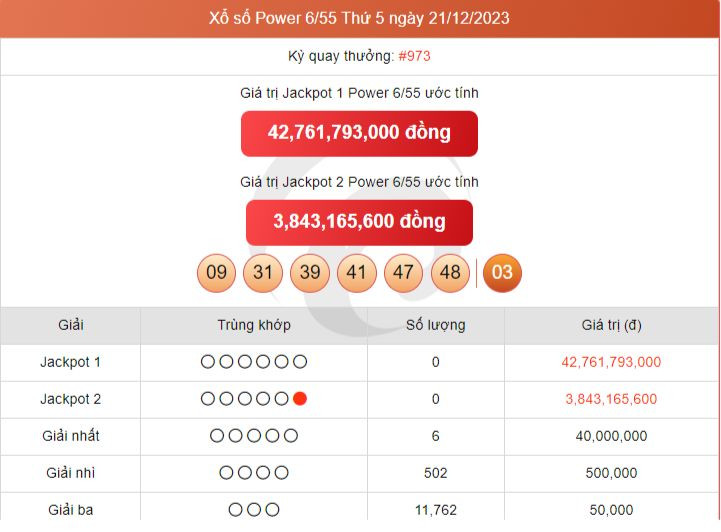 Giải Jackpot: trùng khớp 6 số, giải thưởng trị giá tối thiểu 12 tỷ đồng và tích lũy.