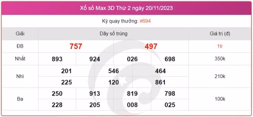 - Giải nhất: Trùng khớp 5 trong 6 số đầu tiên, trị giá 40 triệu đồng cho các vé