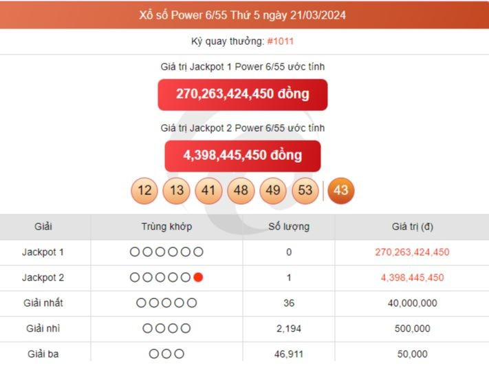 - Giải JACKPOT 1: Trùng khớp 6 số, giá trị giải tối thiểu là 30 tỷ đồng và được cộng dồn tích lũy cho tới khi có người đoán trúng.