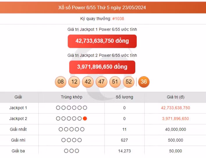 - Giải nhất: Trùng khớp 5 trong 6 số đầu tiên, trị giá 40 triệu đồng cho các vé đoán trúng.