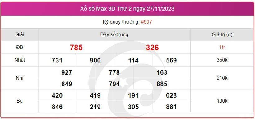 - Giải nhất: Trùng khớp 5 trong 6 số đầu tiên, trị giá 40 triệu đồng cho các vé