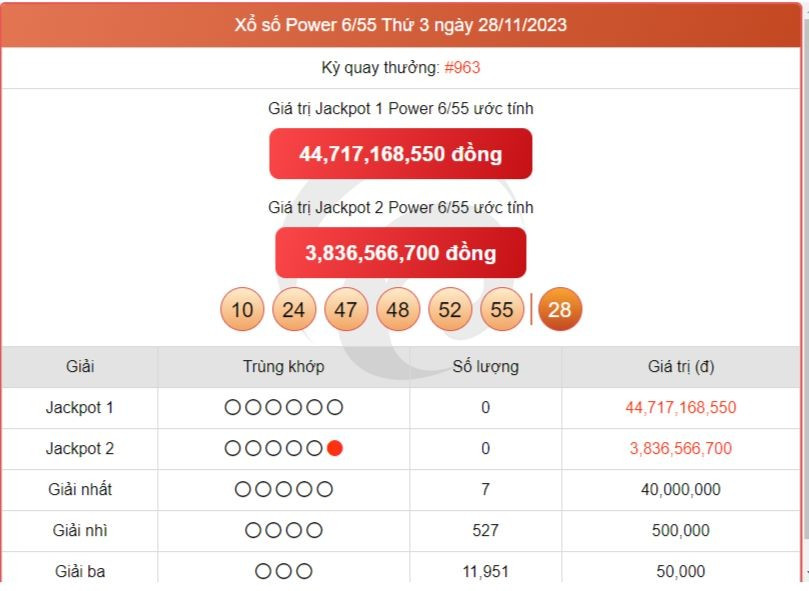 Vietlott 30/11 - Xổ số Power 6/55 30/11 - Vietlott Power 30/11 - Kết quả xổ số Vietlott thứ Năm ngày 30/11/2023