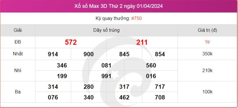 - Giải nhất: Trùng khớp 5 trong 6 số đầu tiên, trị giá 40 triệu đồng cho các vé.