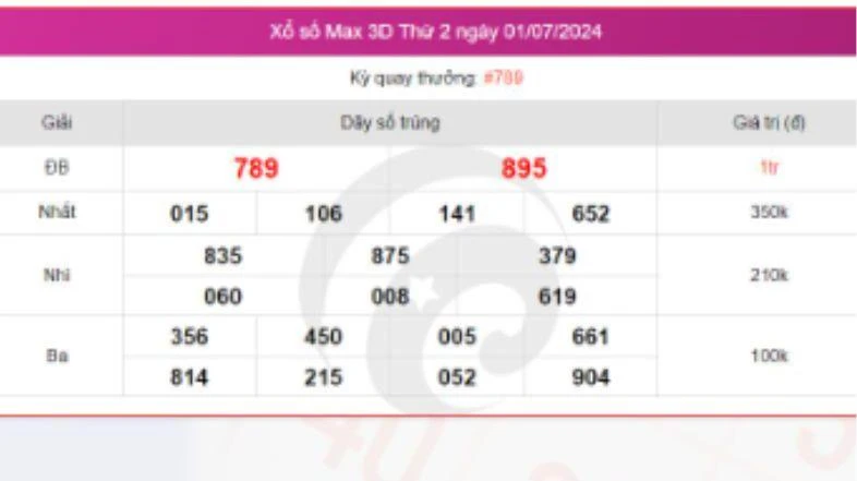 - Giải nhất: Trùng khớp 5 trong 6 số đầu tiên, trị giá 40 triệu đồng cho các vé.