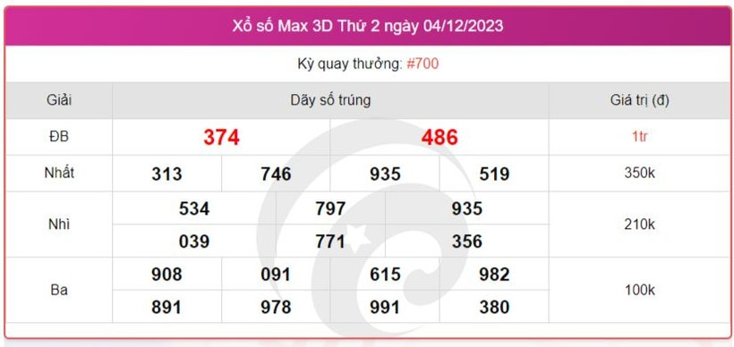 Kết quả xổ số Vietlott thứ Hai ngày 4/12