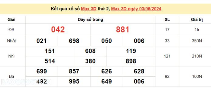 - Giải ba: các vé trùng 3 trong 6 số đầu tiên, trị giá 50.000 đồng cho người chơi đoán trúng.